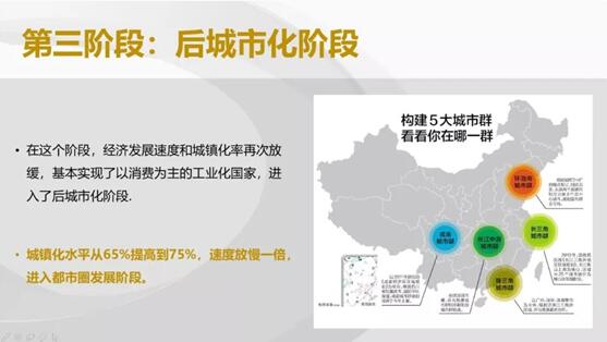 在這個階段,經(jīng)濟(jì)發(fā)展勢頭再次趨于平緩的成熟階段,這時,國家基本從以農(nóng)業(yè)社會為主轉(zhuǎn)型升級到以城市化消費(fèi)為主的社會,進(jìn)入了后城市化階段,城鎮(zhèn)化水平從65%提高到75%,減速發(fā)展。