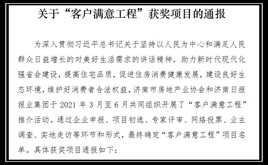 濟(jì)南市“客戶滿意工程”推介活動(dòng)由濟(jì)南市房地產(chǎn)業(yè)協(xié)會(huì)和濟(jì)南日?qǐng)?bào)報(bào)業(yè)集團(tuán)共同組織開(kāi)展,從開(kāi)發(fā)手續(xù)、建筑質(zhì)量、戶型設(shè)計(jì)、綠色建筑、配套設(shè)施、物業(yè)服務(wù)等方面評(píng)分,評(píng)選出客戶滿意的優(yōu)秀房地產(chǎn)項(xiàng)目,具有很強(qiáng)的群眾性和權(quán)威性。