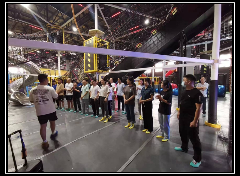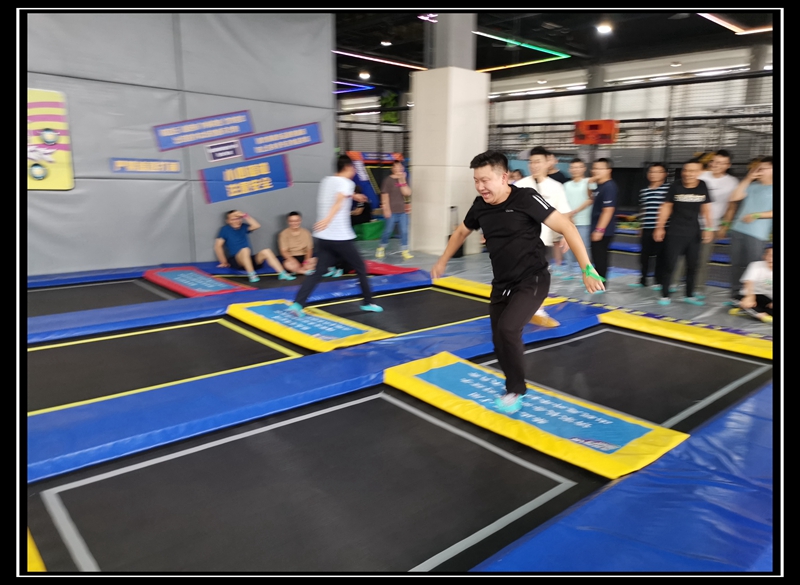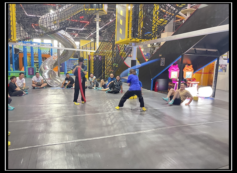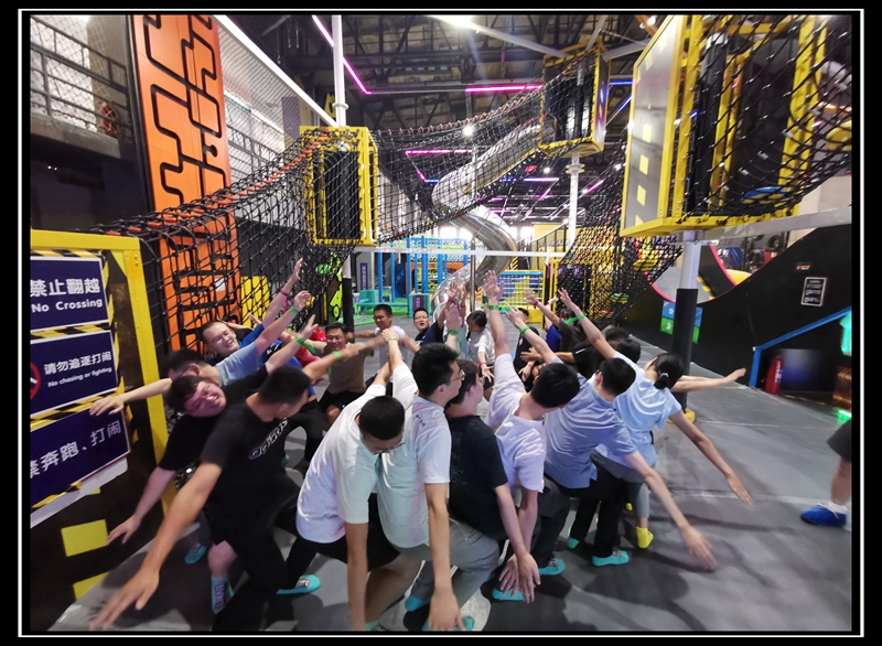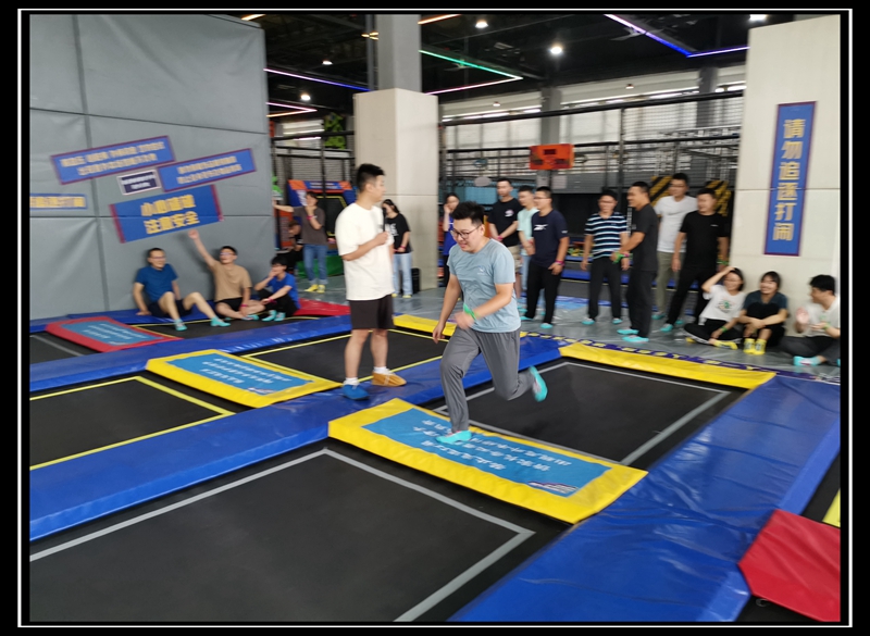 活動開始前,在游戲教練的引導(dǎo)下,雙方員工通過熱身小游戲快速融入團隊,增進彼此的溝通和熟悉程度。接著,為增強游戲體驗感,教練根據(jù)現(xiàn)場人數(shù)、男女比例,形成兩支隊伍,通過兵來將擋、躲避球、攔路虎、蹦床接力等方式,開展對抗賽。在蹦床的角斗比賽環(huán)節(jié),每隊選出隊長作為攔路虎,進入對方賽道,游戲開始時,選手首先依次跳過蹦床到達攔路虎所在位置,與攔路虎進行猜拳游戲,贏家返回與下一位隊員擊掌接力,輸家則圍著攔路虎左右轉(zhuǎn)圈6次,再進行猜拳直到勝利。這不僅考驗選手本身的運動能力,更是考驗團隊配合力。隨著熟悉程度和游戲環(huán)節(jié)的層層推進,青年們在加油聲、歡笑聲中盡情跳躍、奔跑,充分感受腳底傳來的十足彈力,充分釋放生活壓力和工作情緒,充分展現(xiàn)青年活力和自我風(fēng)采。幾輪比賽下來,員工們即蹦出了活力,又凝聚了士氣,整個活動現(xiàn)場都洋溢著熱烈、歡快的青春氣息。