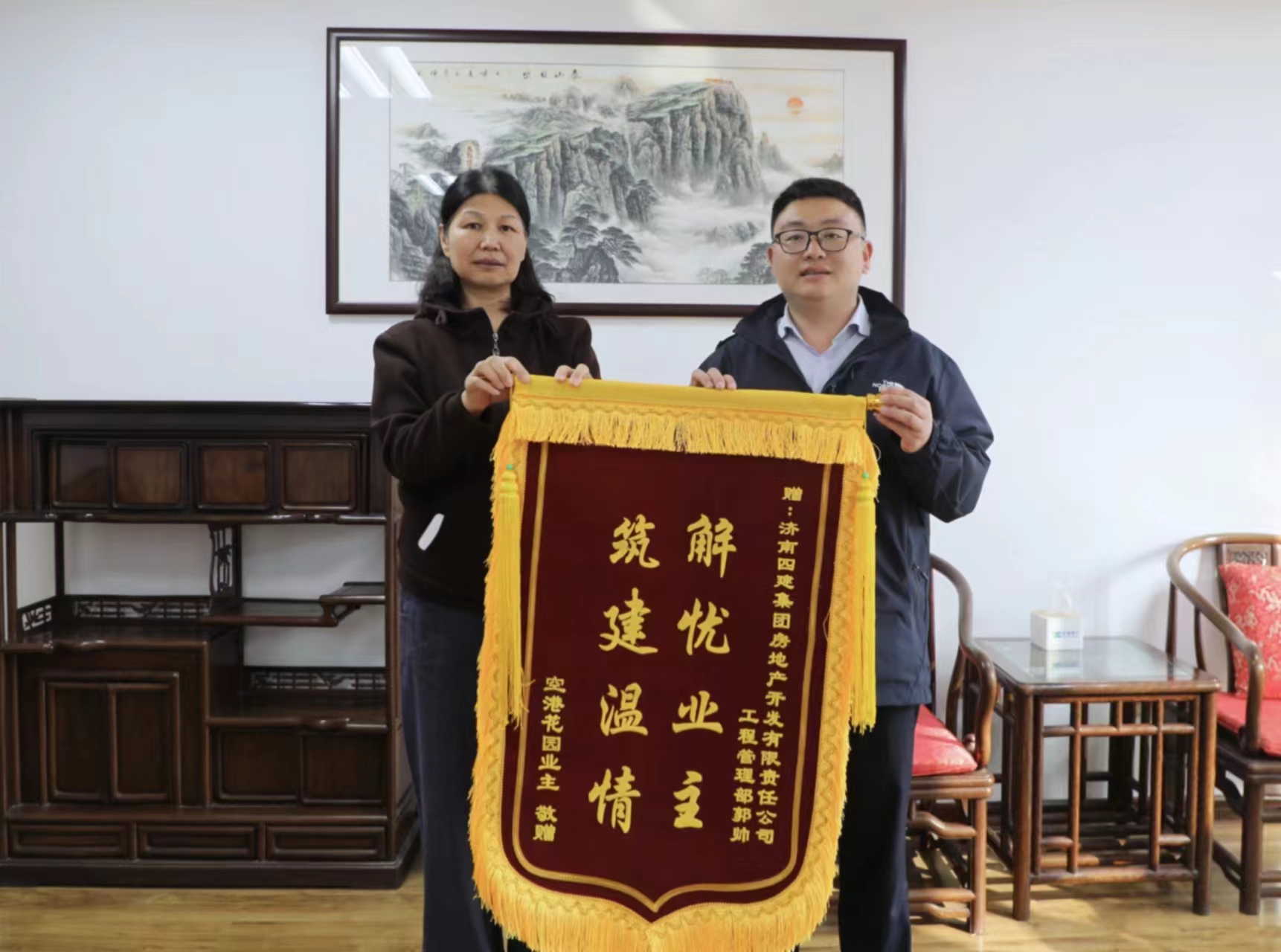 11月1日下午兩點半,空港花園業(yè)主手捧兩面錦旗來到四建地產(chǎn)辦公樓,對四建地產(chǎn)及工程管理部郭帥同志在維修服務(wù)中展現(xiàn)的真誠負責、國企擔當表示感謝。